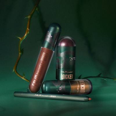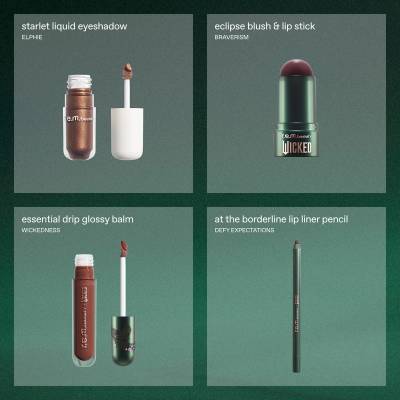 An alluring set inspired by Elphaba's magical & powerful color palette — including a liquid eyeshadow, blush & lip stick, lip liner, and glossy balm.
