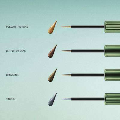 Inspired by the Emerald City, a set of reflective dip-well eyeliners made for bold graphics or delicate linework in Oz's favorite metallic shades.