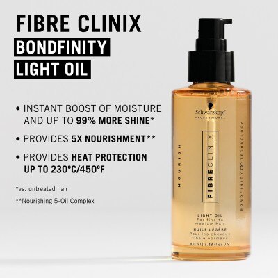 Distribute between the palms to transform the cream into a hair oil. Multiple uses: Pre-Shampoo: Apply throughout damp hair for extra nourishment. Rinse thoroughly before shampooing. Booster: Mix 2–6 pumps with 25g of the desired Fibre Clinix Bondfinity Treatment for an additional nourished hair feel. Apply on damp hair. Leave in for up to 10 minutes. Rinse thoroughly. Blow-Dry: Apply on damp hair for heat protection up to 230°C/450°F and improved manageability. Finishing Oil: Apply to mid-lengths and ends on dry hair and style as usual.
