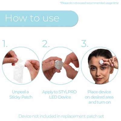 1. Clean and dry face 2. Unpeel a Sticky Patch. Stick to STYLPRO LED Device. 3. Peel the off plastic tab 4. Turn on the STYLPRO LED Device press onto face 5. Wait 10-minutes. Peael LED Device off leaving Sticky Patch on the skin. Leave on overnight or for 5+ hours.
