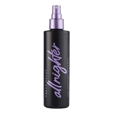 After applying makeup, shake bottle well. Hold 8\–10\ away and mist face 2–4 times, in an “X” and “T” formation, until fully saturated. Want extra-intense shadow colour, less fallout, and even longer wear? Wet your brush with All Nighter before you apply. Warning: Keep out of eyes. Close eyes before misting.